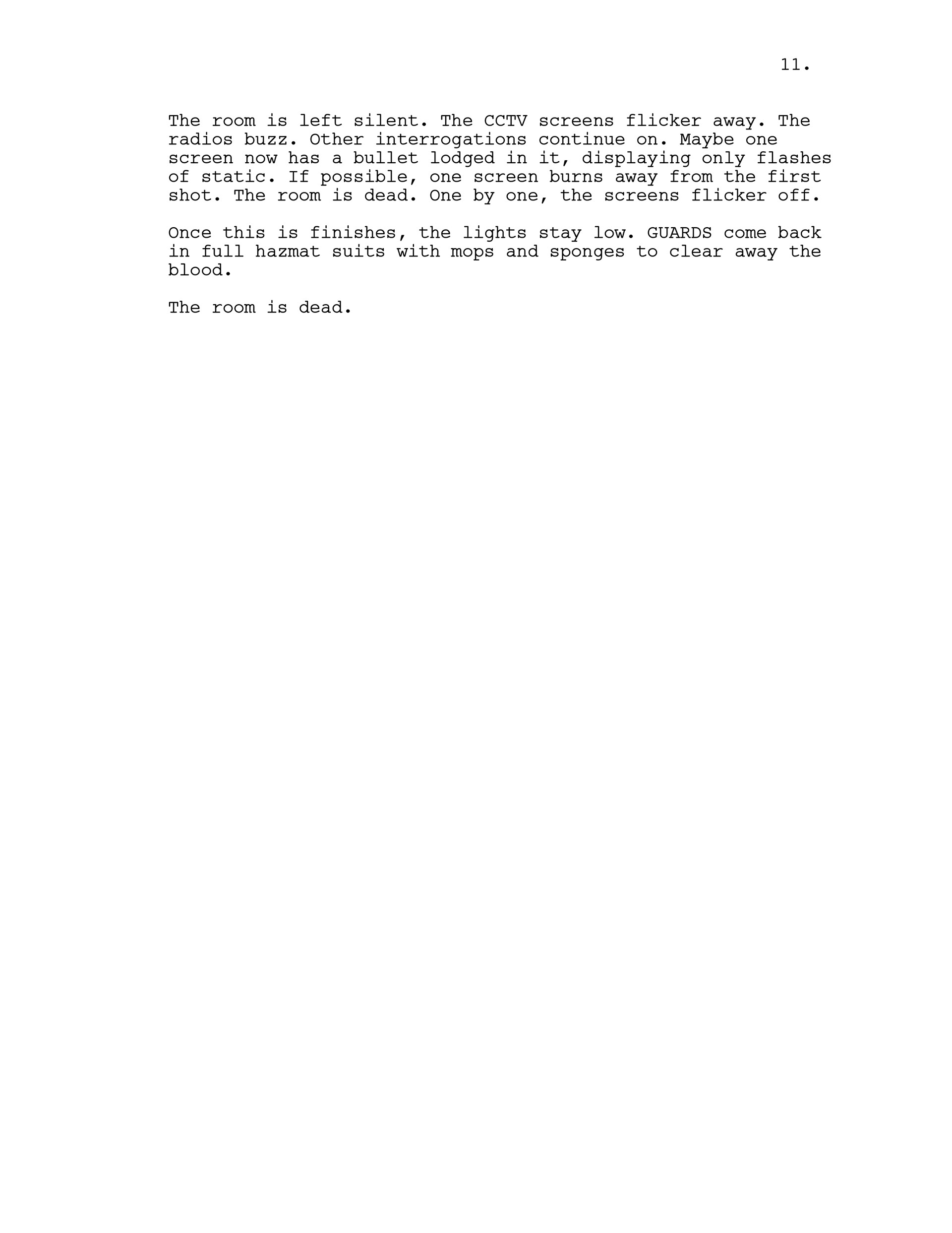 Ray runs off screen, through the fire escape door. Interrogator turns and shoot him through the camera/screen, in the physical space.