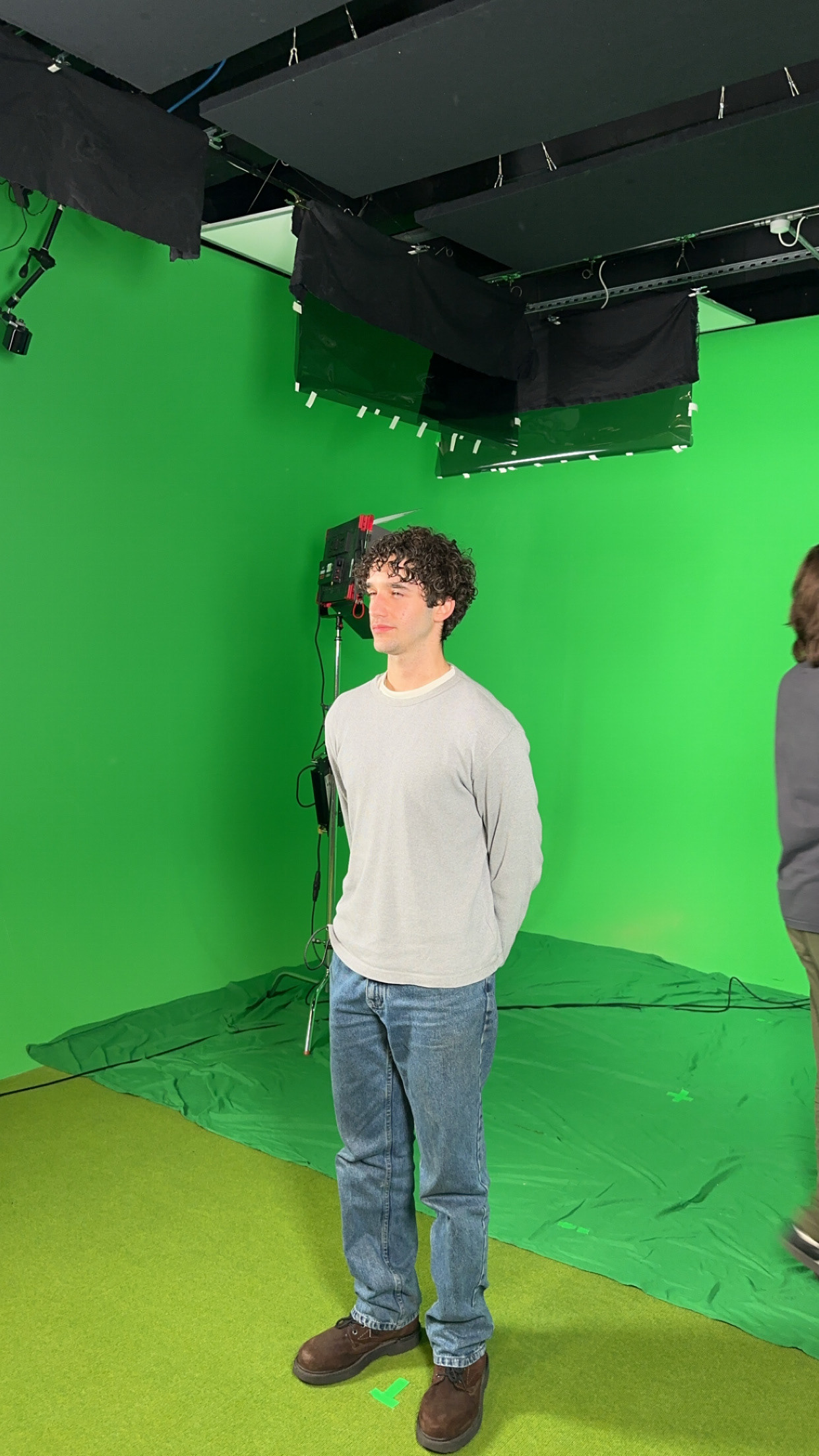 Today, we had the first Green Screen tutorial. We went over the basics of filming against a green screen, exposing the background 1-2 stops higher than the subject, making it easier to key out later, and lighting the subject and background to help this. Peter was our first guinea pig, standing in front of the camera while we took turns setting up lights and framing him correctly.