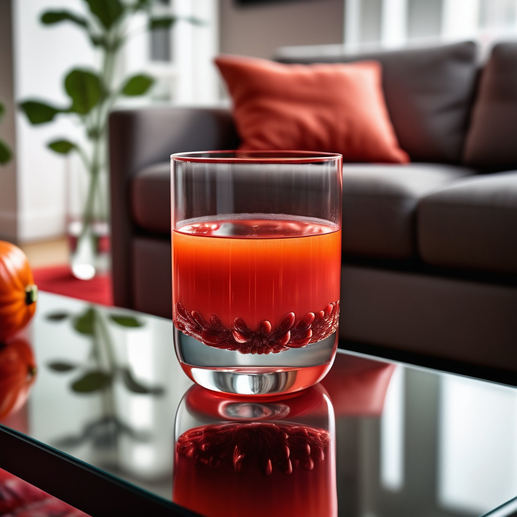 "photorealistic, (ultra-detailed), straight-sided glass, overflowing with light red liquid resembling red squash, set on a sleek glass table, cozy living room ambiance, soft-focus on a stylish sofa in the background, highlighting reflections and translucency, warm lighting creates inviting atmosphere, vivid and refreshing colors in liquid, shallow depth of field for artistic effect."